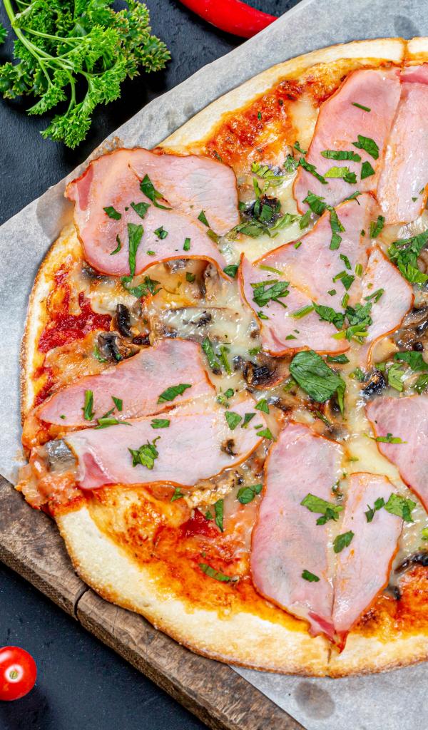 Wallpaper Large pizza with ham on a table with pepper, garlic and parsley