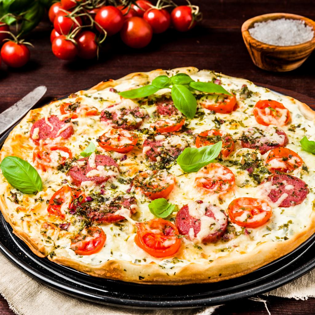 Wallpaper Tasty pizza with sausage, cheese and tomatoes on the table