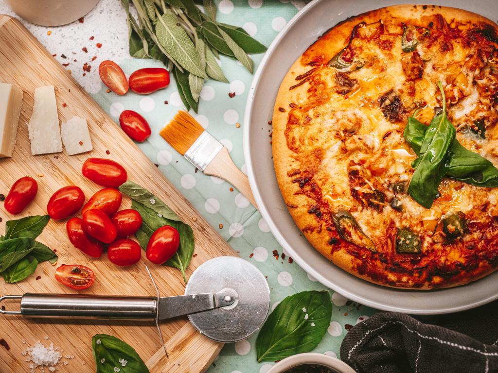 Wallpaper Rosy pizza on a table with cheese and tomatoes