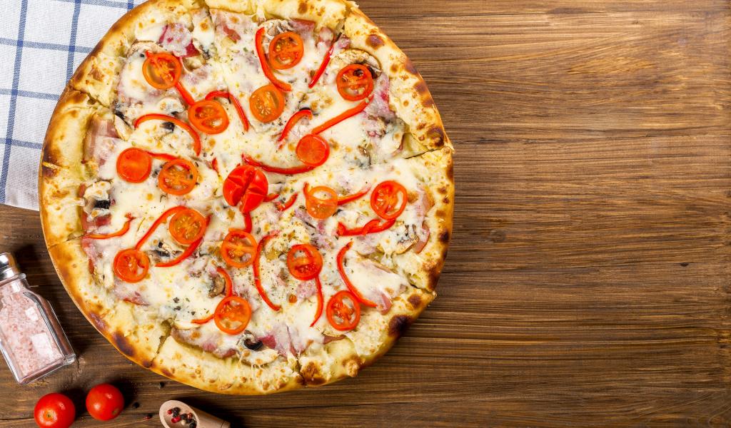 Wallpaper Pizza with bacon on the table with tomatoes and peppers