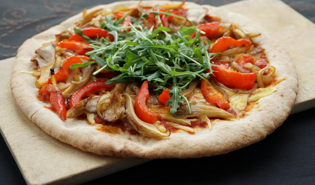 Wallpaper Pizza with mushrooms, paprika and arugula leaves