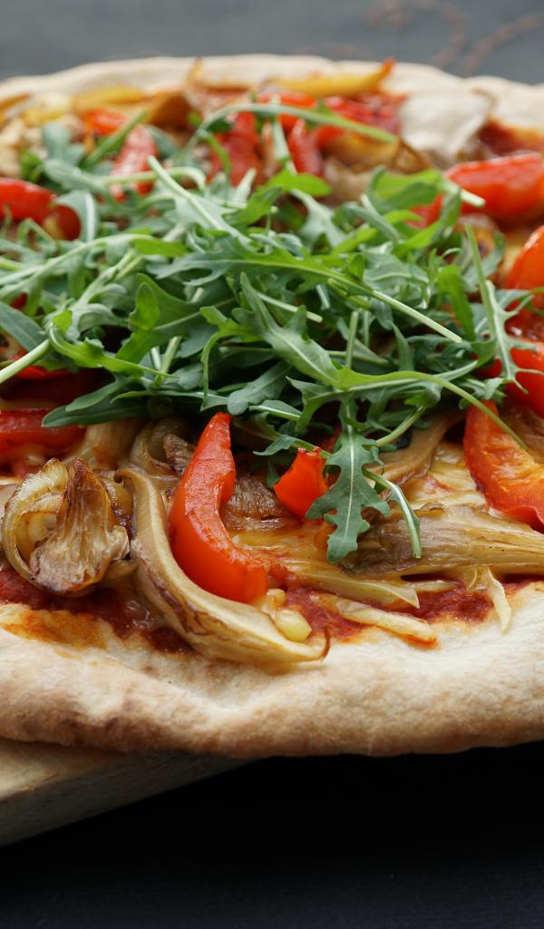 Wallpaper Pizza with mushrooms, paprika and arugula leaves