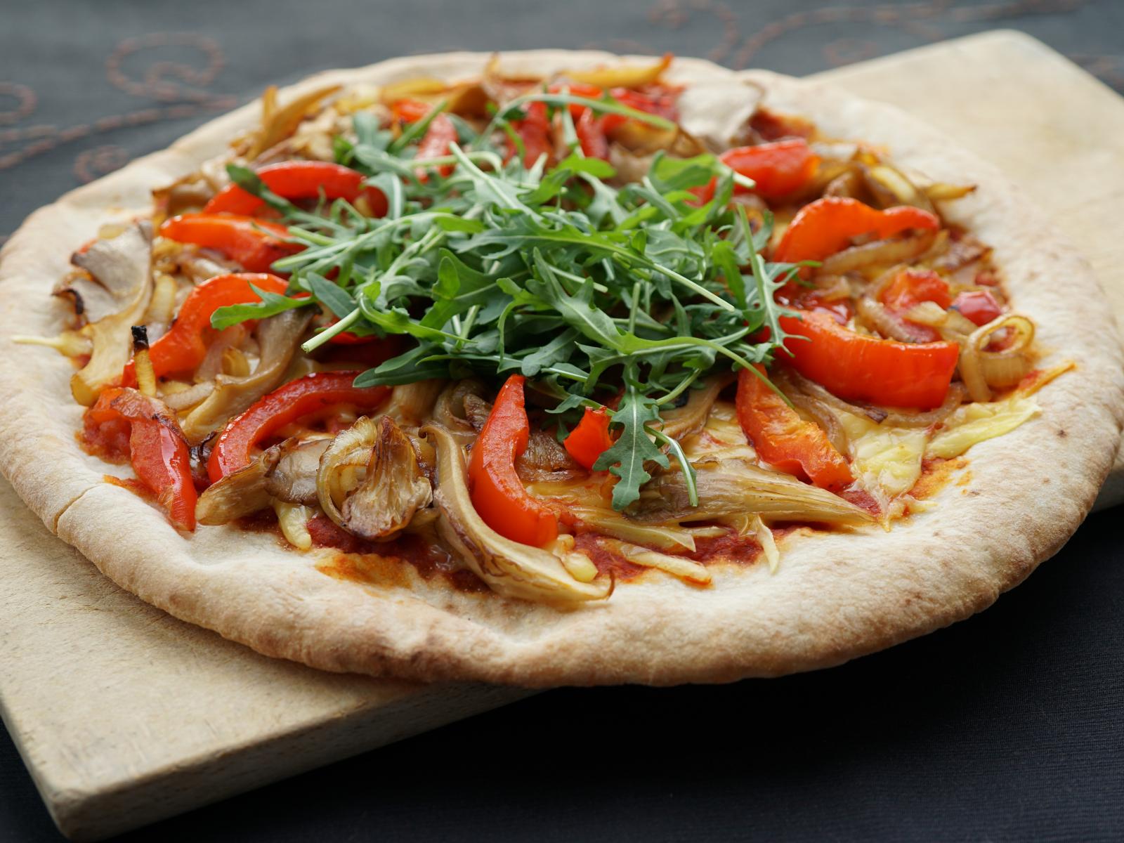 Wallpaper Pizza with mushrooms, paprika and arugula leaves