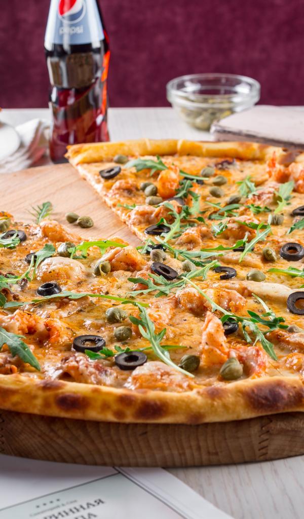 Wallpaper Big appetizing pizza with olives on a table in a cafe