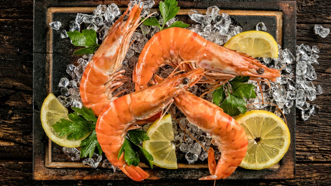 Wallpaper Boiled shrimp with lemon and ice slices