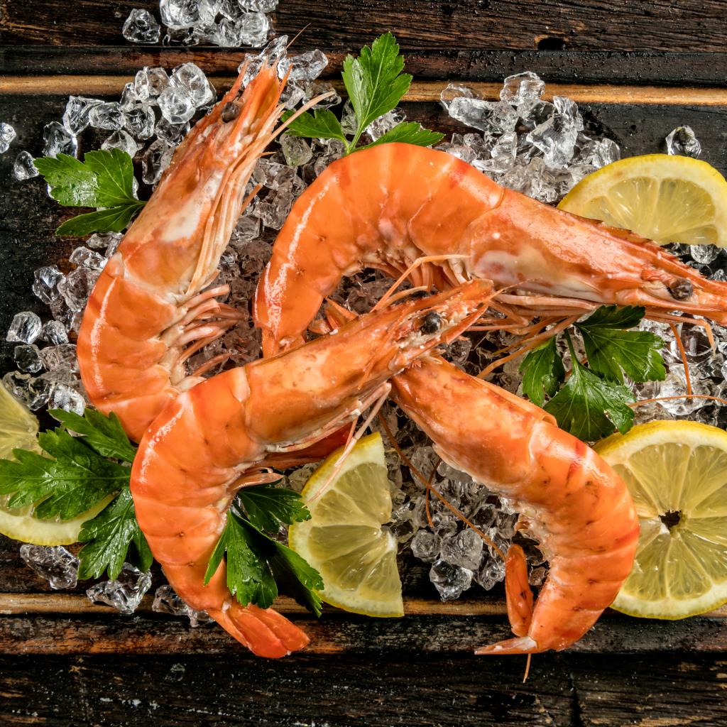 Wallpaper Boiled shrimp with lettuce on a cutting board