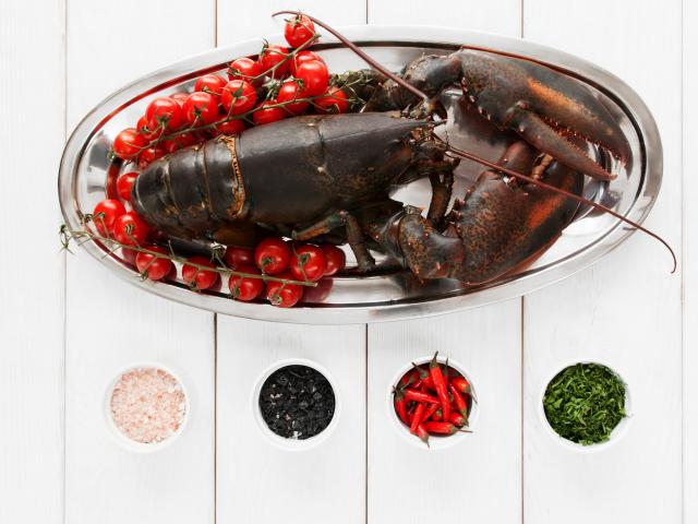 Wallpaper Large lobster on a platter with tomatoes and spices