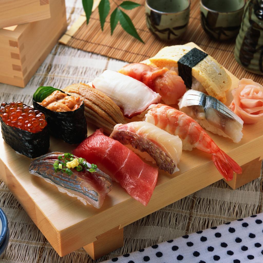 » Wallpaper Appetizing Japanese sushi on a wooden board