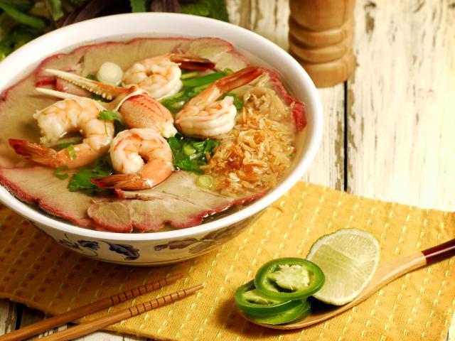 Wallpaper A bowl of soup with shrimps and seafood on the table