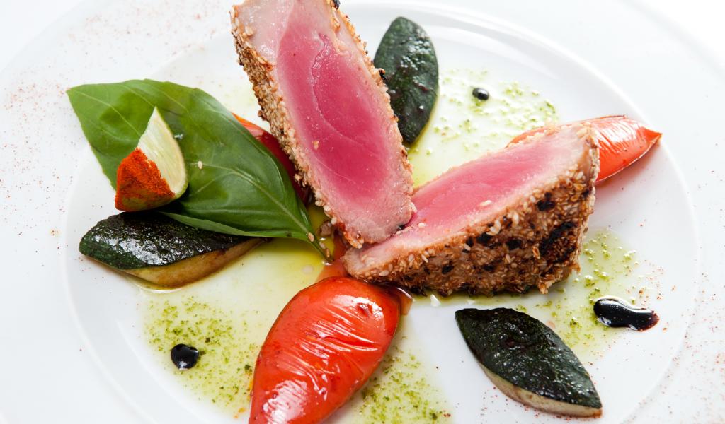 Wallpaper Appetizing tuna steak with vegetables on a white plate