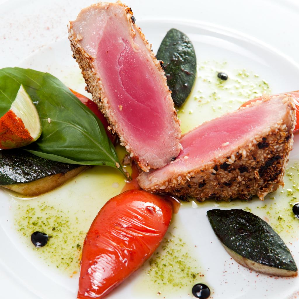 Wallpaper Appetizing tuna steak with vegetables on a white plate