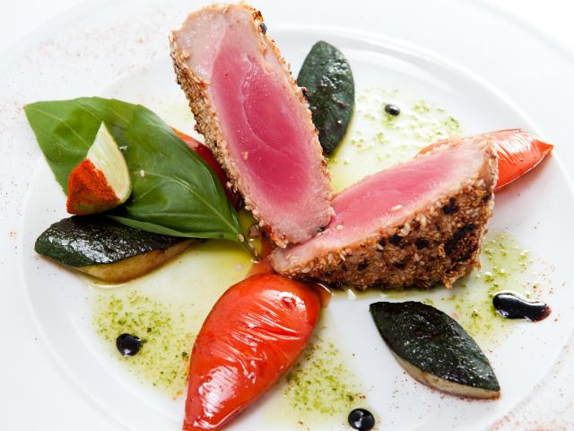 Wallpaper Appetizing tuna steak with vegetables on a white plate