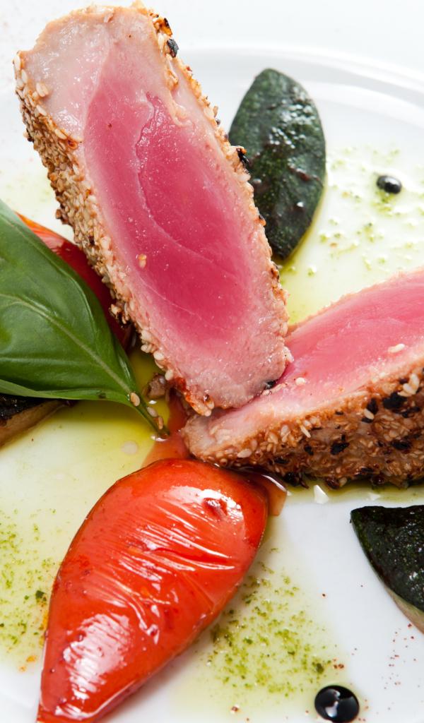 Wallpaper Appetizing tuna steak with vegetables on a white plate