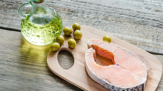 Wallpaper Salmon steak with olives and olive oil