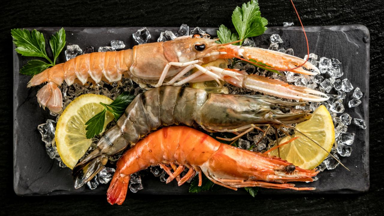 Wallpaper Large shrimps with slices of lemon