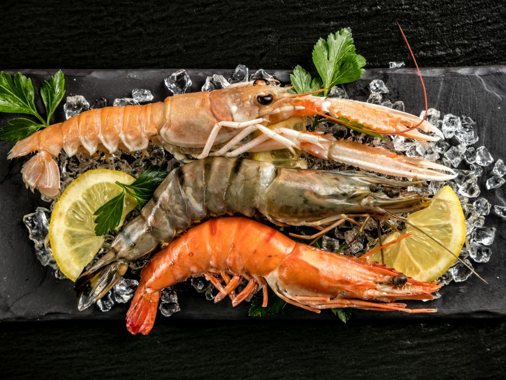 Wallpaper Shrimps on a cutting board with garlic, lemon and spices