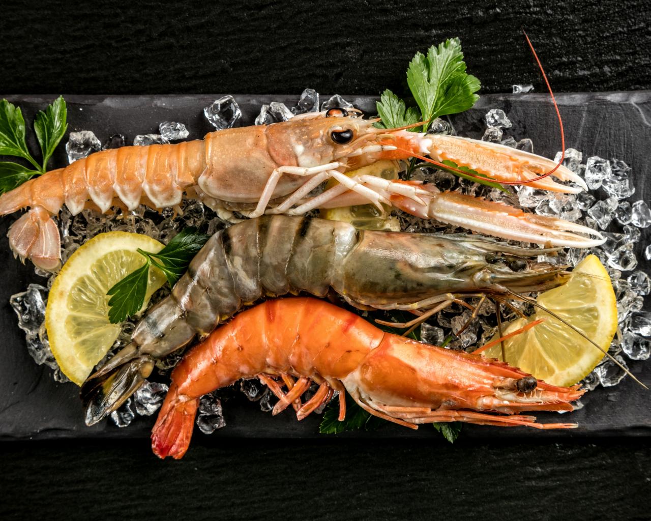 Wallpaper Shrimps on a cutting board with garlic, lemon and spices