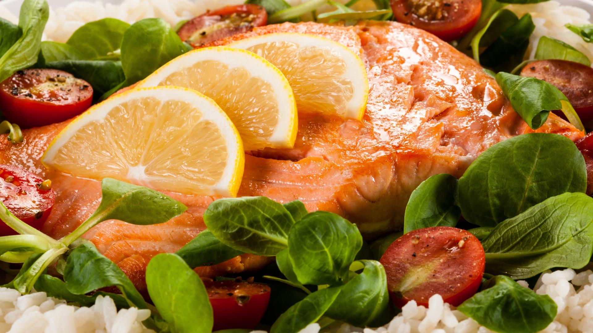 Wallpaper Fried red fish with lemon, tomatoes, spinach and rice