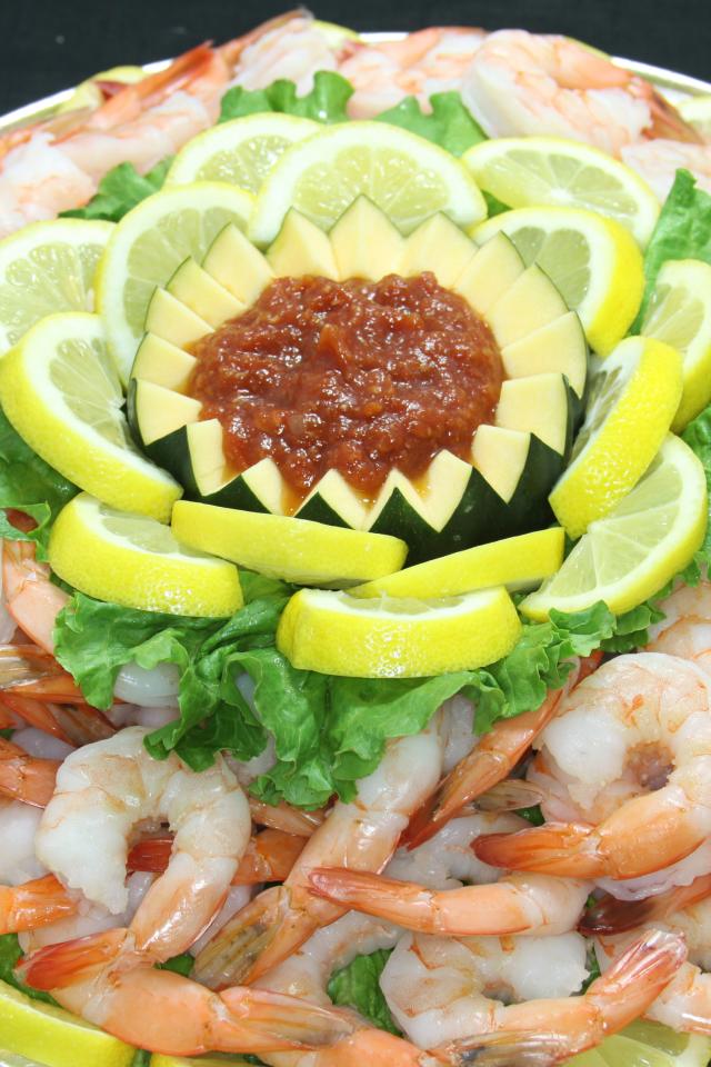 Wallpaper Boiled shrimps with lemon and sauce on a large plate