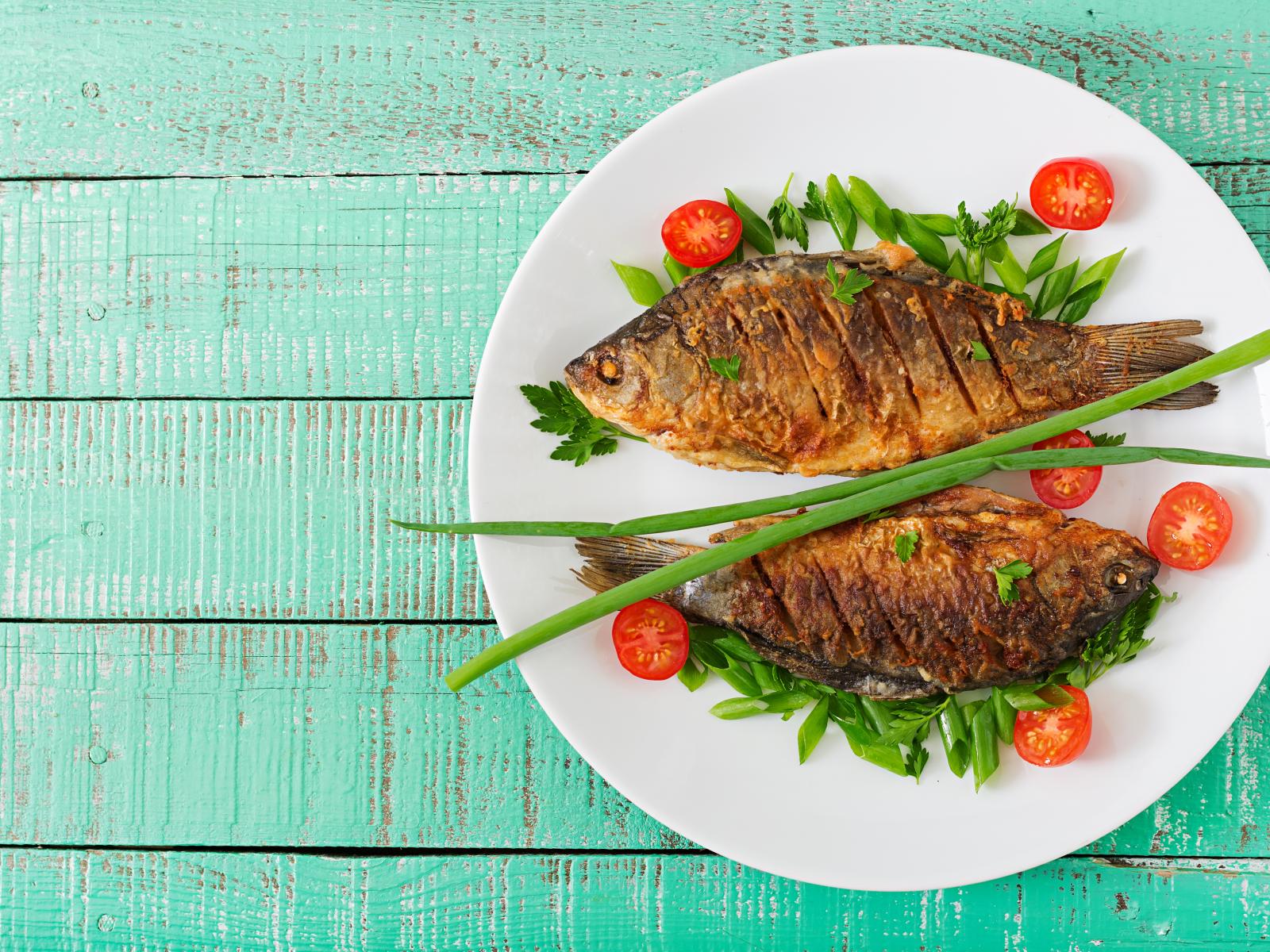 Wallpaper Fried fish with tomatoes and herbs on the table
