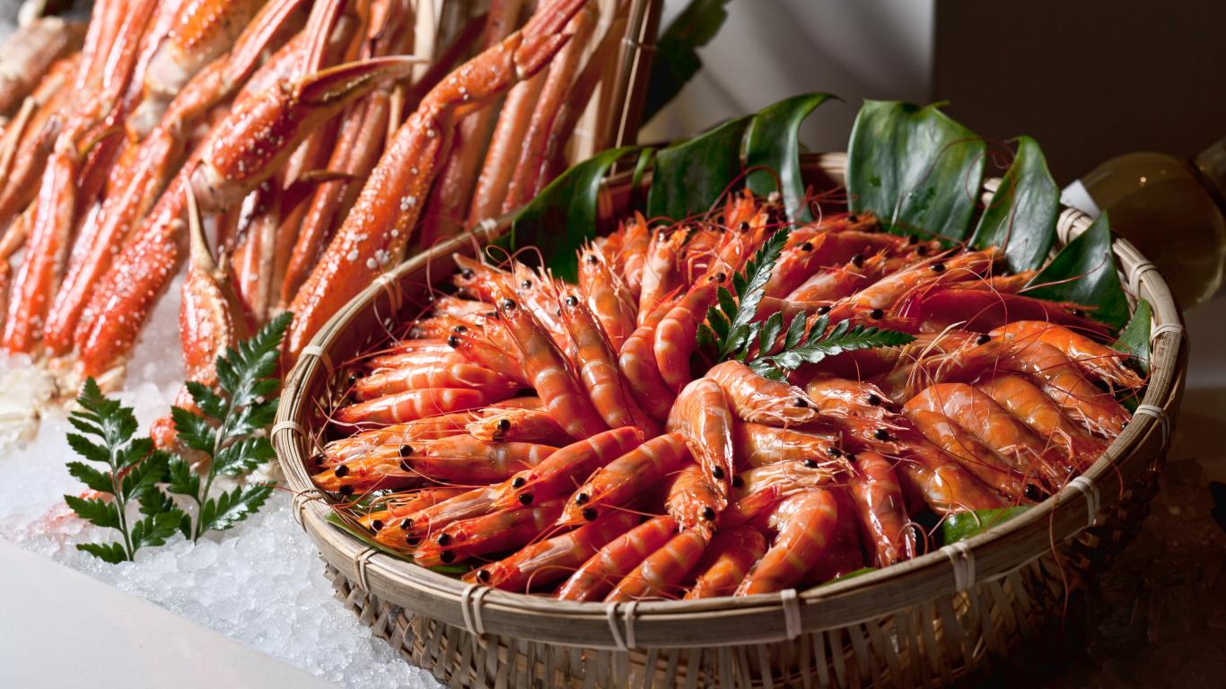 Wallpaper Boiled shrimps are crabs in a basket on the table