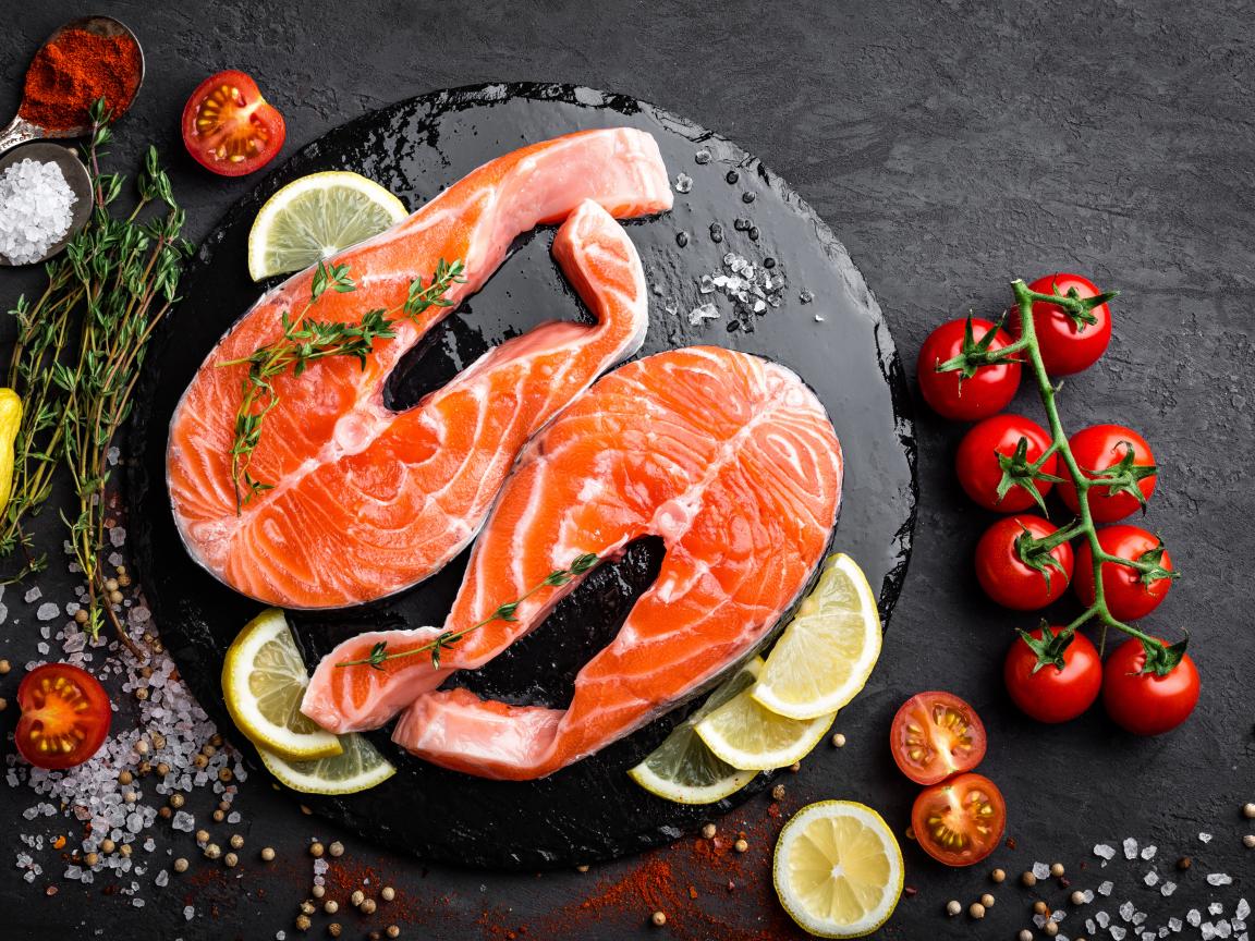 Wallpaper Two pieces of red fish with vegetables on a black background