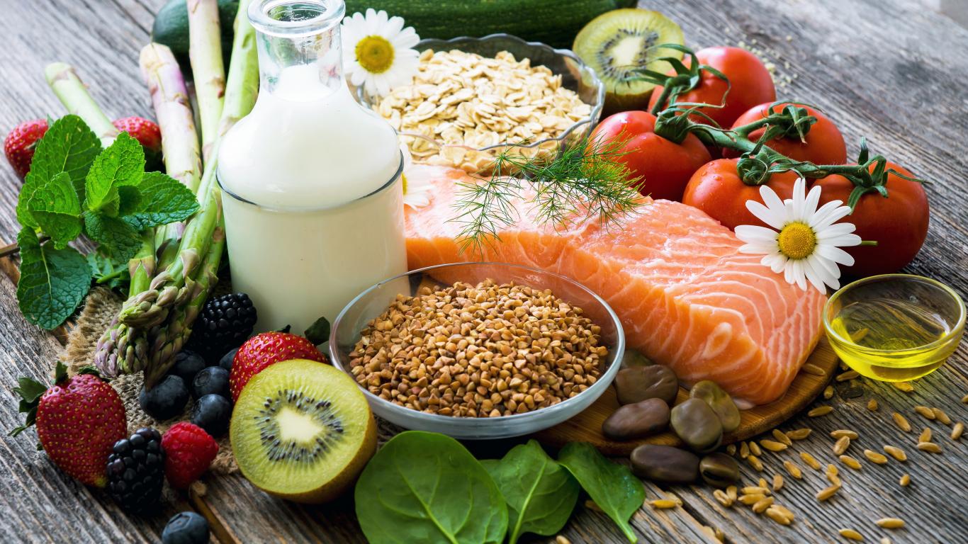 Wallpaper A piece of red fish on the table with berries and vegetables