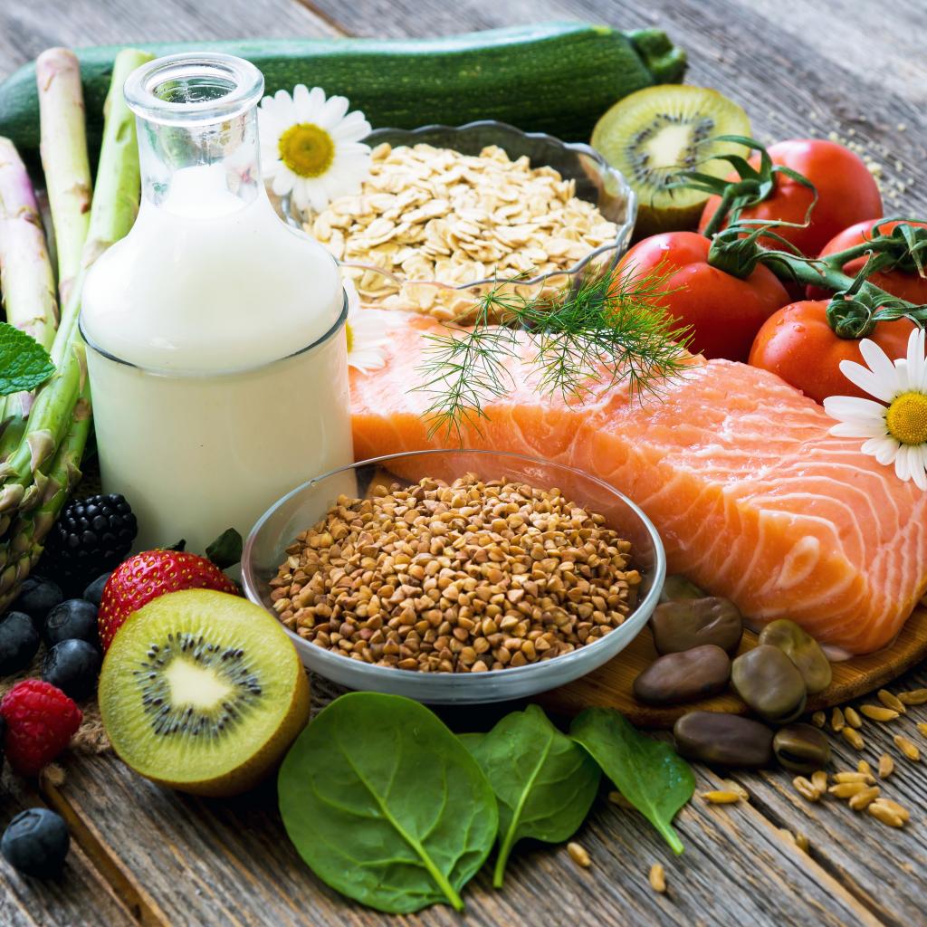 Wallpaper A piece of red fish on the table with berries and vegetables