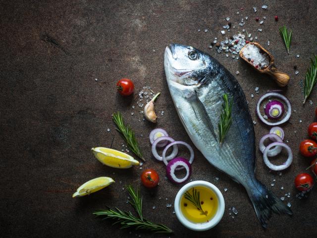 Wallpaper Fresh fish on the table with vegetables and spices