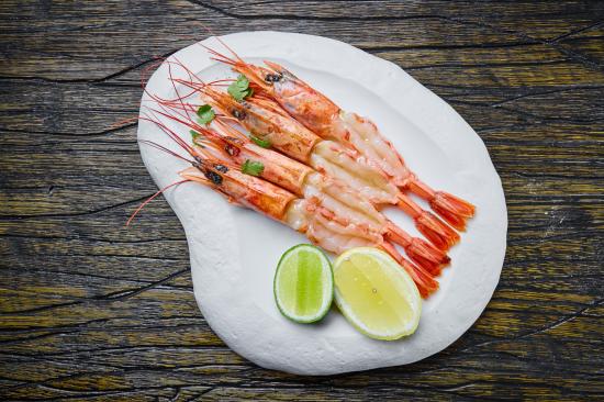Wallpaper Appetizing prawns on a white plate with lemon