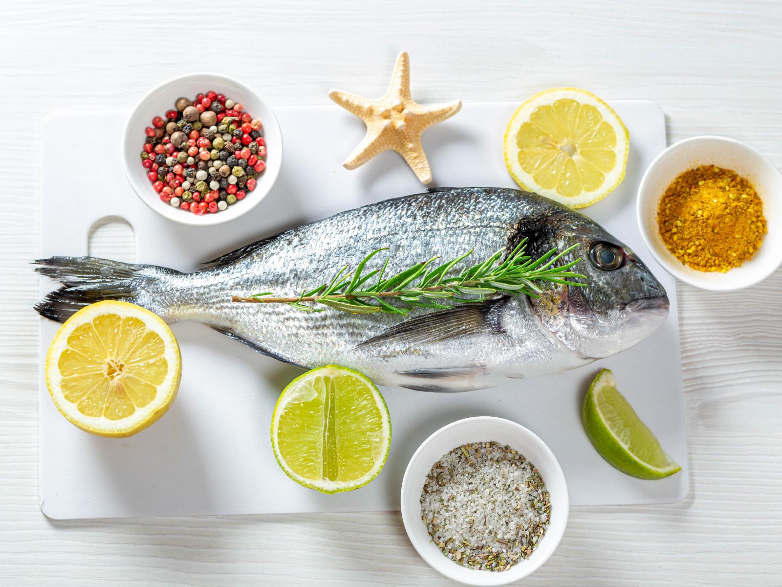 Wallpaper Fresh fish on a board with salt, pepper, turmeric and lemon