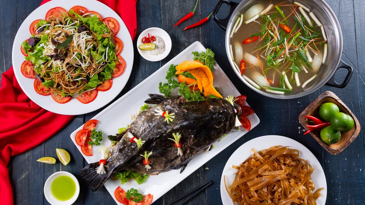 Wallpaper Stuffed fish on a table with vegetables