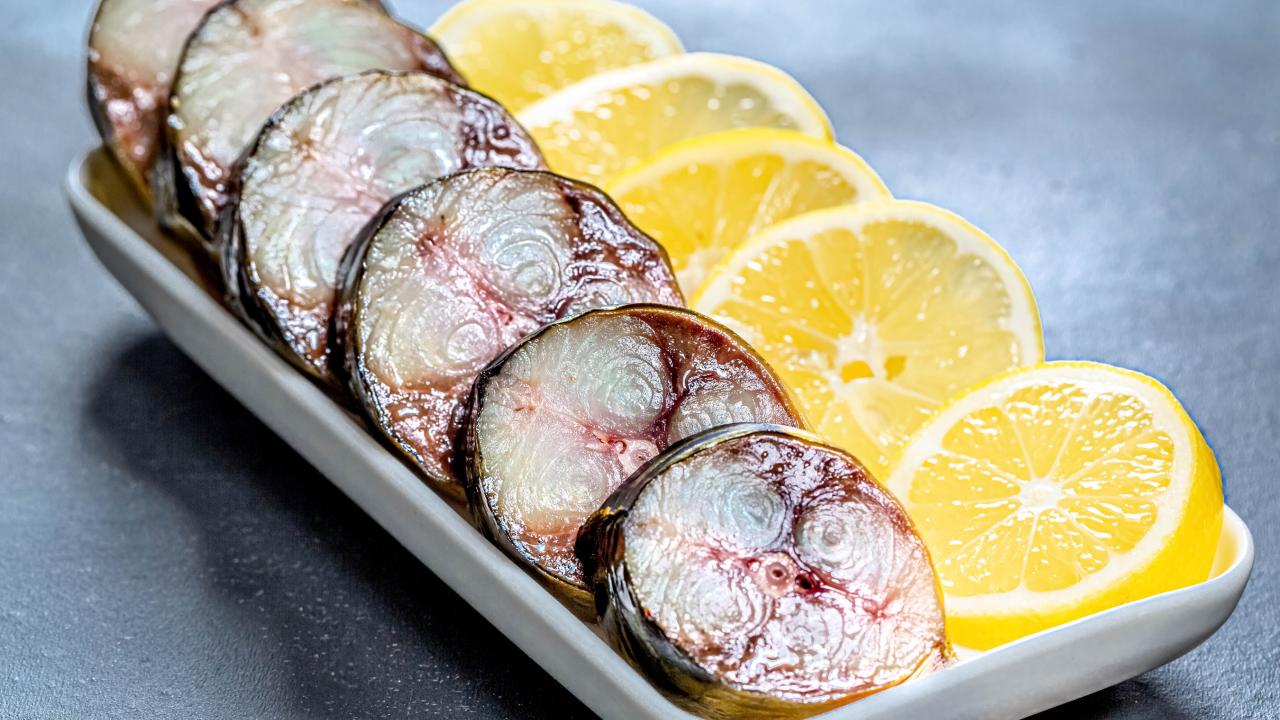 Wallpaper Sliced mackerel in a plate with slices of lemon