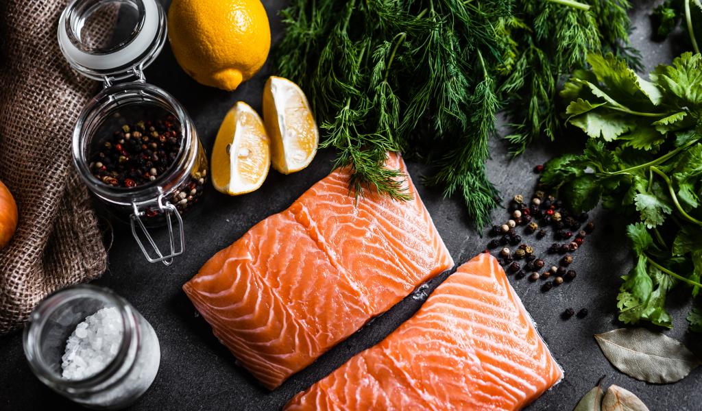 Wallpaper Pieces of red fish on a table with herbs and spices