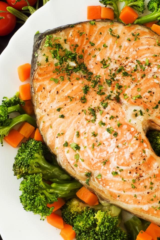 Wallpaper A piece of red fish on a plate with carrots and broccoli