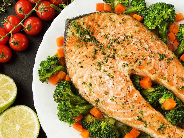 Wallpaper A piece of red fish on a plate with carrots and broccoli