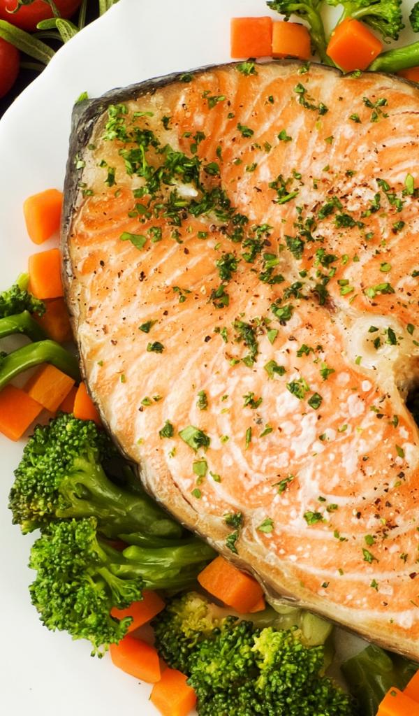 Wallpaper A piece of red fish on a plate with carrots and broccoli