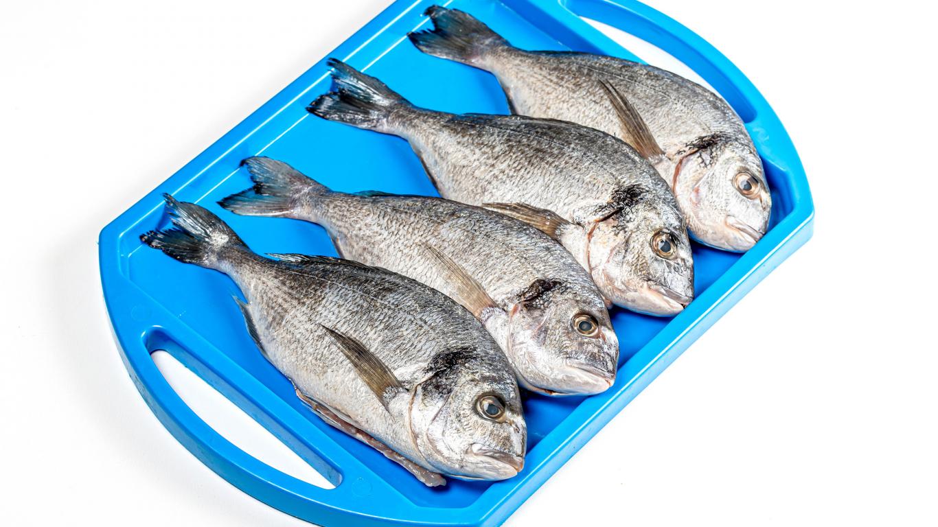 Wallpaper Fresh fish on a blue tray on a white background