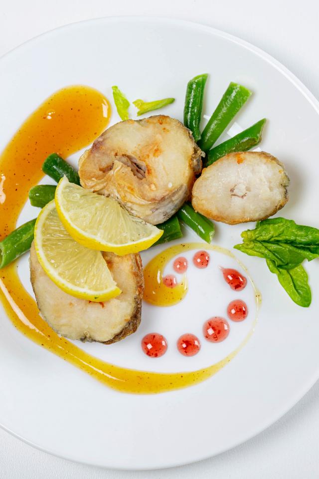 Wallpaper Sliced fried fish on a white plate with lemon and herbs
