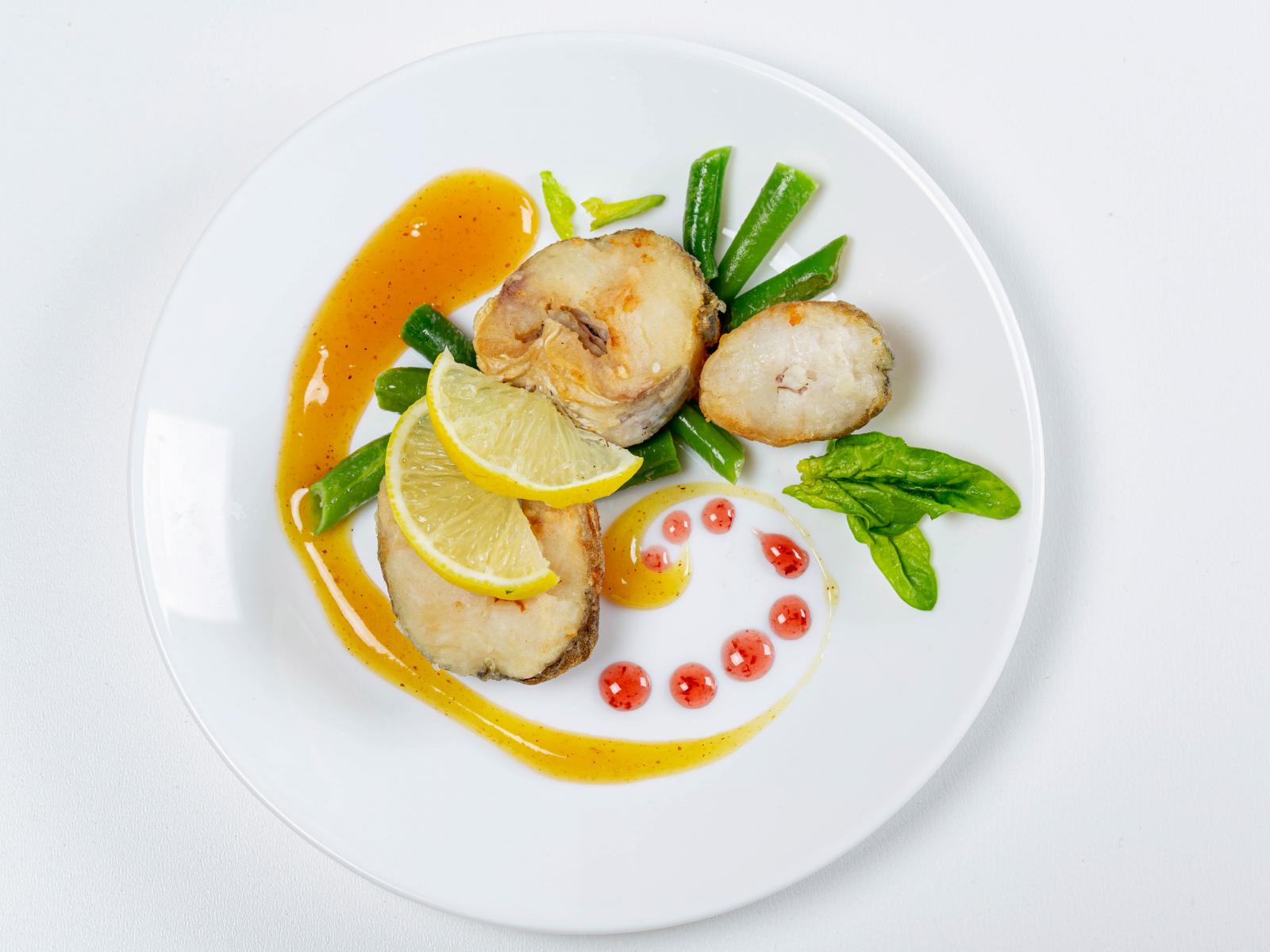 Wallpaper Sliced fried fish on a white plate with lemon and herbs