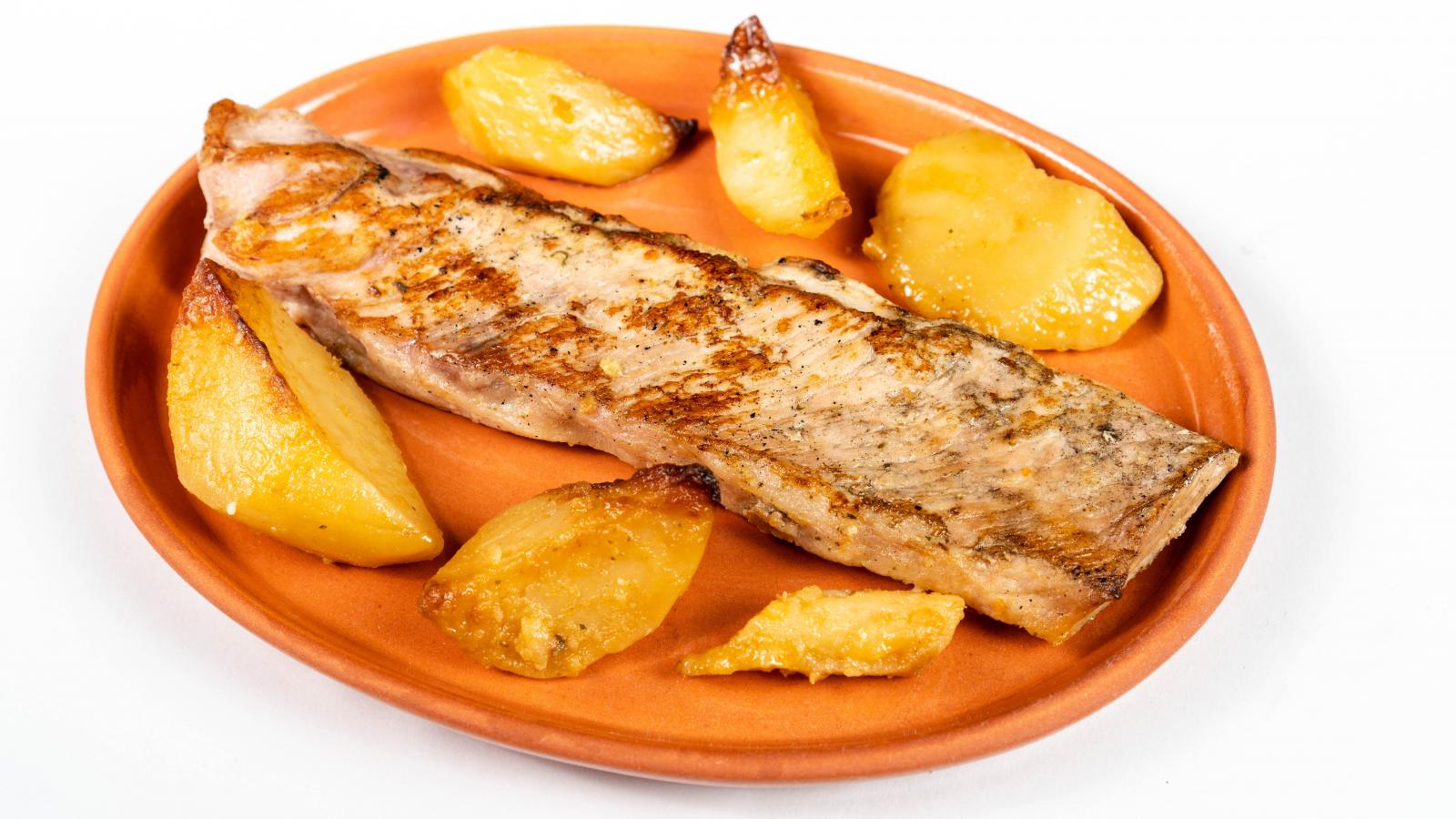 Wallpaper A piece of baked fish on a plate with potatoes