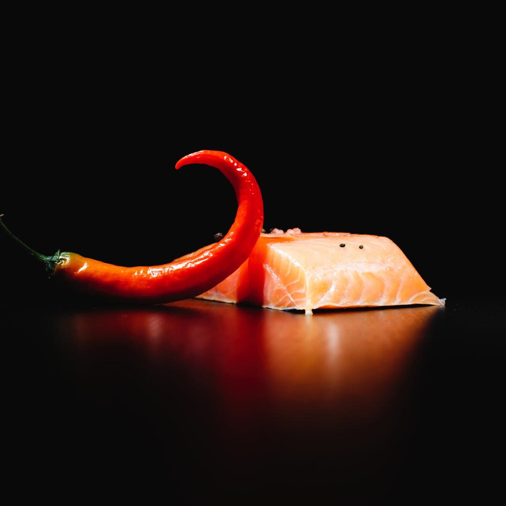 Wallpaper Piece of red fish with hot red pepper on a black background