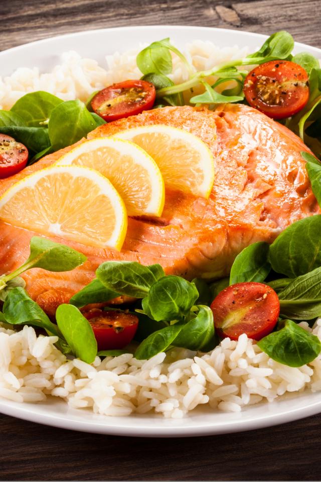 Wallpaper Piece of fish on a plate with tomatoes, rice and basil leaves