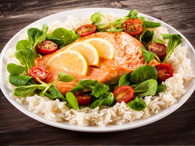 Wallpaper Piece of fish on a plate with tomatoes, rice and basil leaves