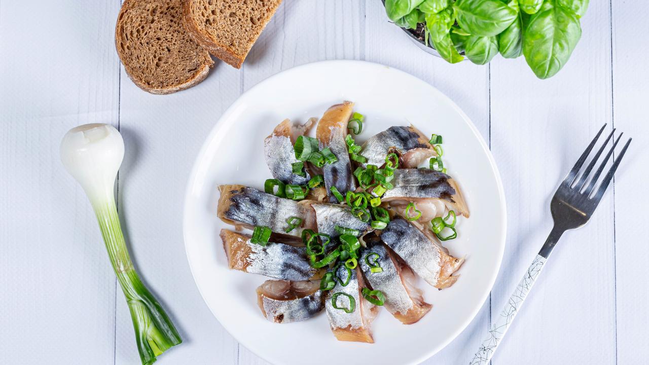 Wallpaper Pieces of mackerel on the table with onions, bread and basil