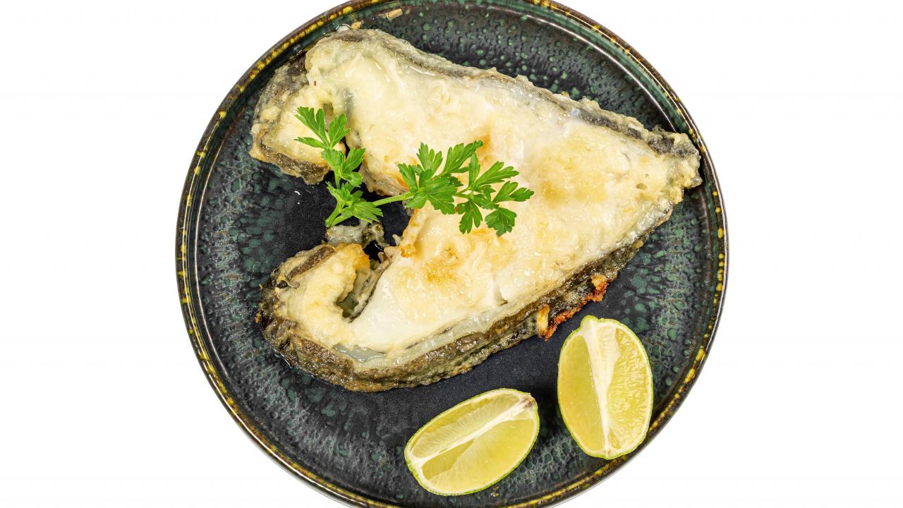 Wallpaper Piece of fish on a plate with lemon on a white background