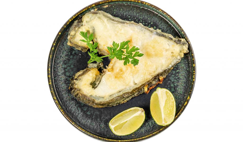 Wallpaper Piece of fish on a plate with lemon on a white background
