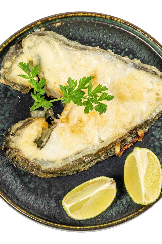 Wallpaper Piece of fish on a plate with lemon on a white background