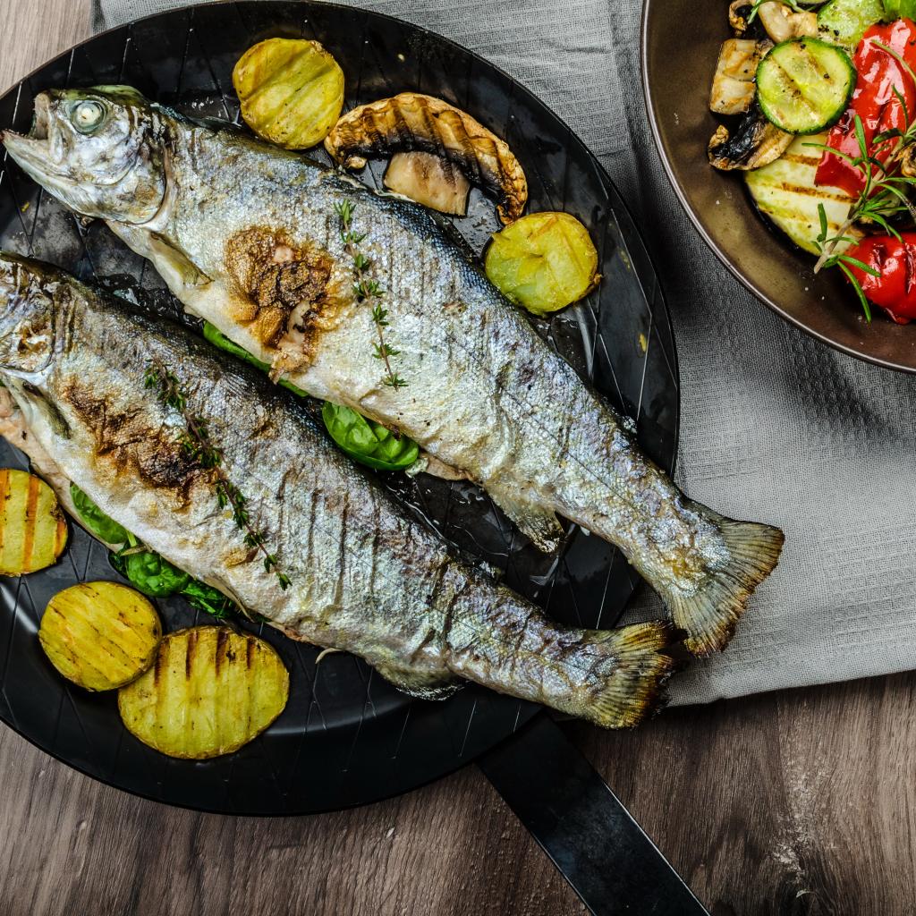 Wallpaper Grilled fish on a board with vegetables