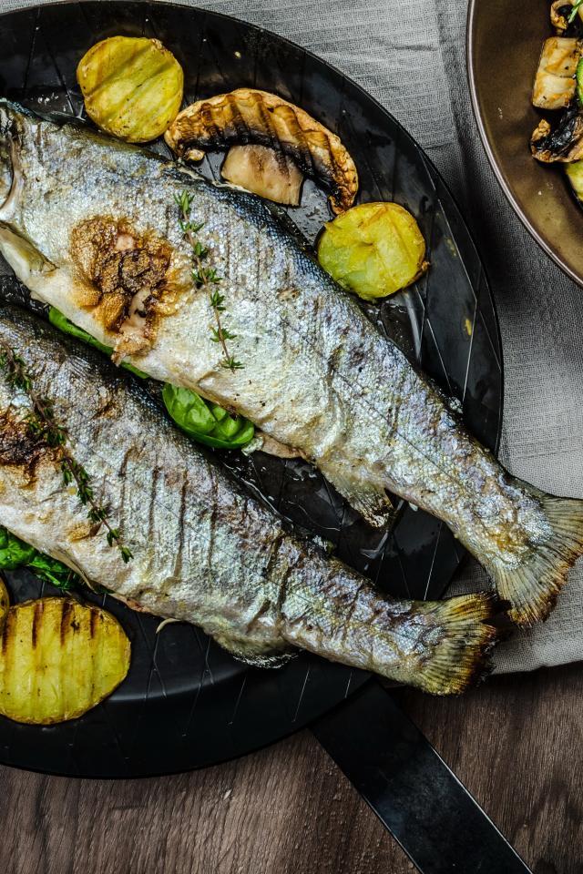 Wallpaper Grilled fish on a board with vegetables